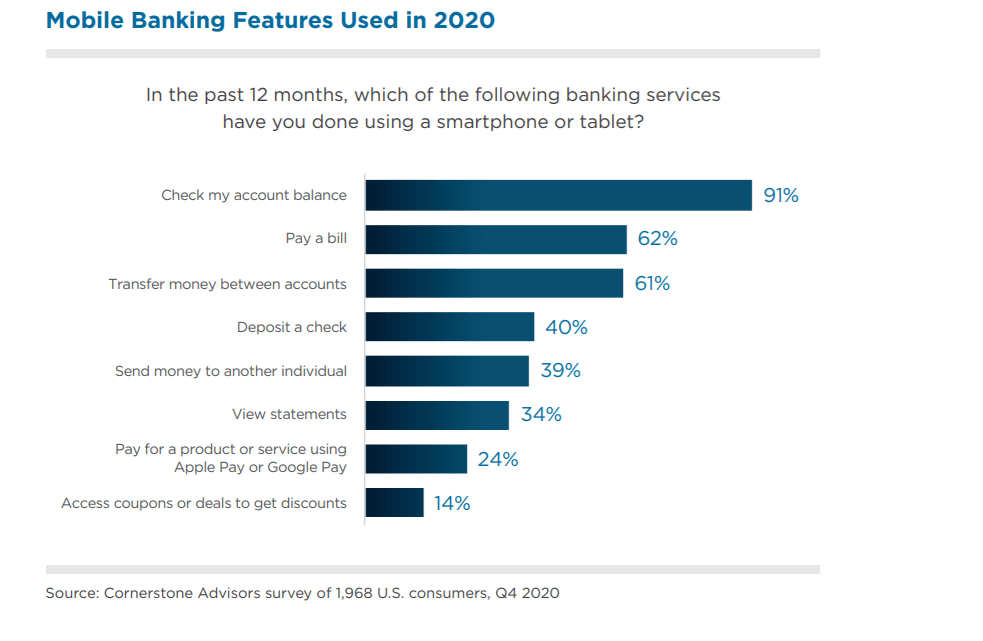 According to the report from Cornerstone Advisors and Mitek, around 90% of mobile banking users use the app to check account balances, more than 60% pay bills and transfer money between accounts, and around 40% of people deposit checks, send money to others and view statements.